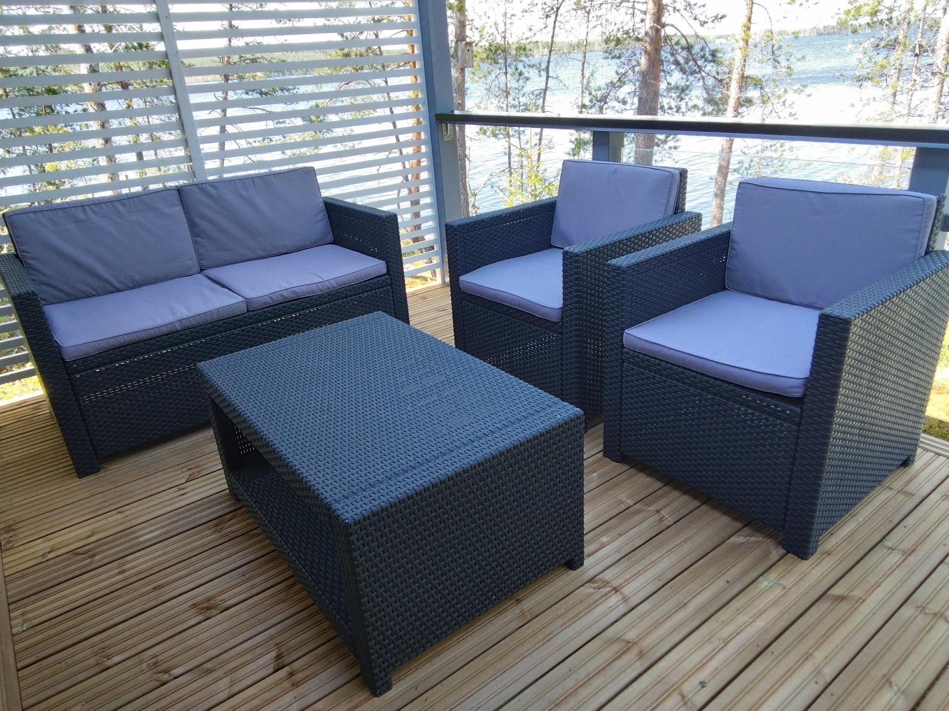 Terassilla on sohvaryhmä ja saunan edessä ruokailuryhmä.